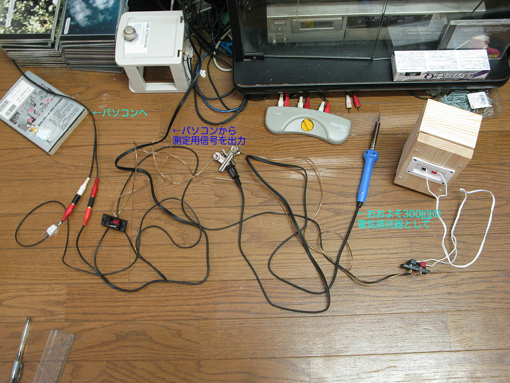 インピーダンスの測定の様子。「ザァァァ〜〜〜ッ」という信号をスピーカに流して、元の信号とスピーカを通してみた信号とのレベル差を測ることで検知しているようである。よぉ〜く写真を見てみると、どのような具合で測っているのかひらめいていただけると思う。詳しくは「LIMP」を調べてみてください。