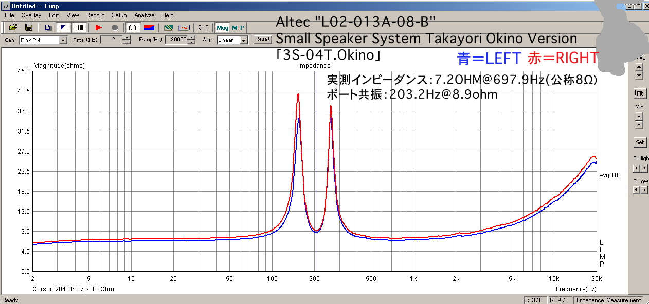右と左でグラフがそっくりでないのは「個体差」があるからなので仕方がないにしても、どちらもほぼ同一のグラフになっている。これは、まず「箱」の完成度の高さを示している。理論的に、左右ともほぼそろった響きを出力できることが分かる。